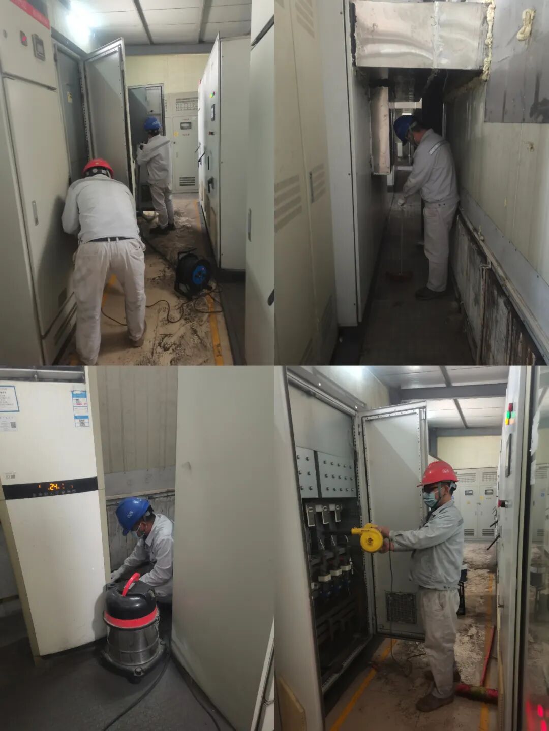為確保除塵工作有序進行,突擊隊員們提前謀劃,制定了詳細的除塵方案、劃分責任片區(qū),并由公司應急管理部安全專員對參與人員統(tǒng)一進行安全交底。除塵過程中,突擊隊員采用了“吸塵器+軟毛刷深度清理”相結合的方式,重點清除了散熱風扇葉片、濾網及風道內的灰塵和雜物,有效避免了因積灰導致設備過熱而引發(fā)的故障。同時,他們還同步對逆變器、箱變功能模塊進行了全面檢查、逐個清理,對松動的部件進行了緊固,確保設備處于良好的運行狀態(tài)。